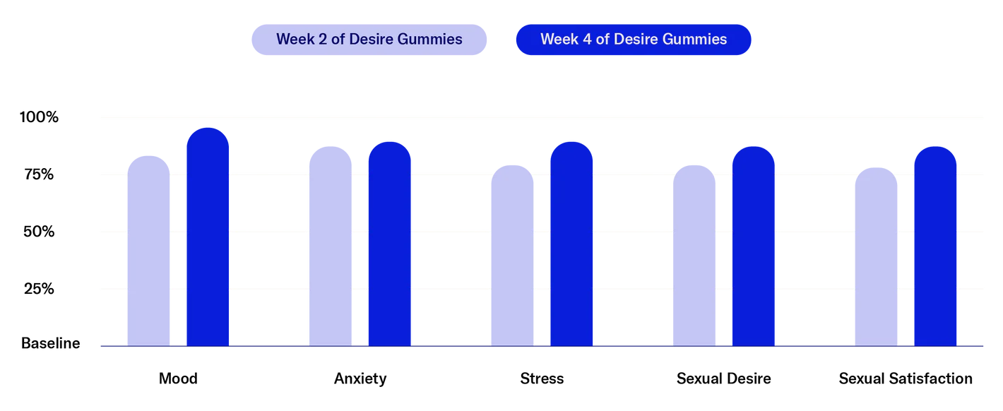 With regular use over 2-4 weeks, Desire Gummies have been shown to improve mood and increase sexual desire and satisfaction, all while reducing stress and anxiety, as seen in this clinical study.